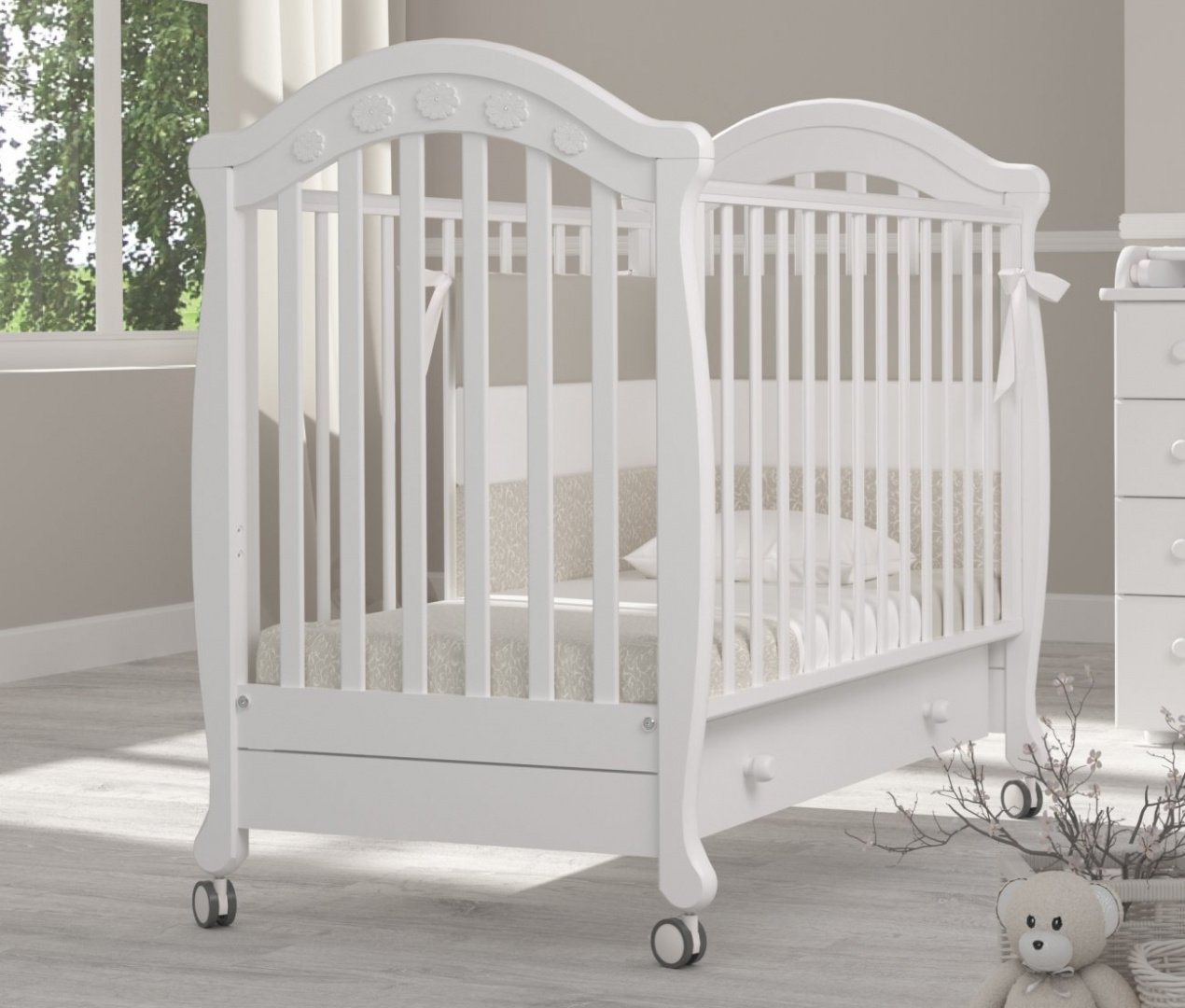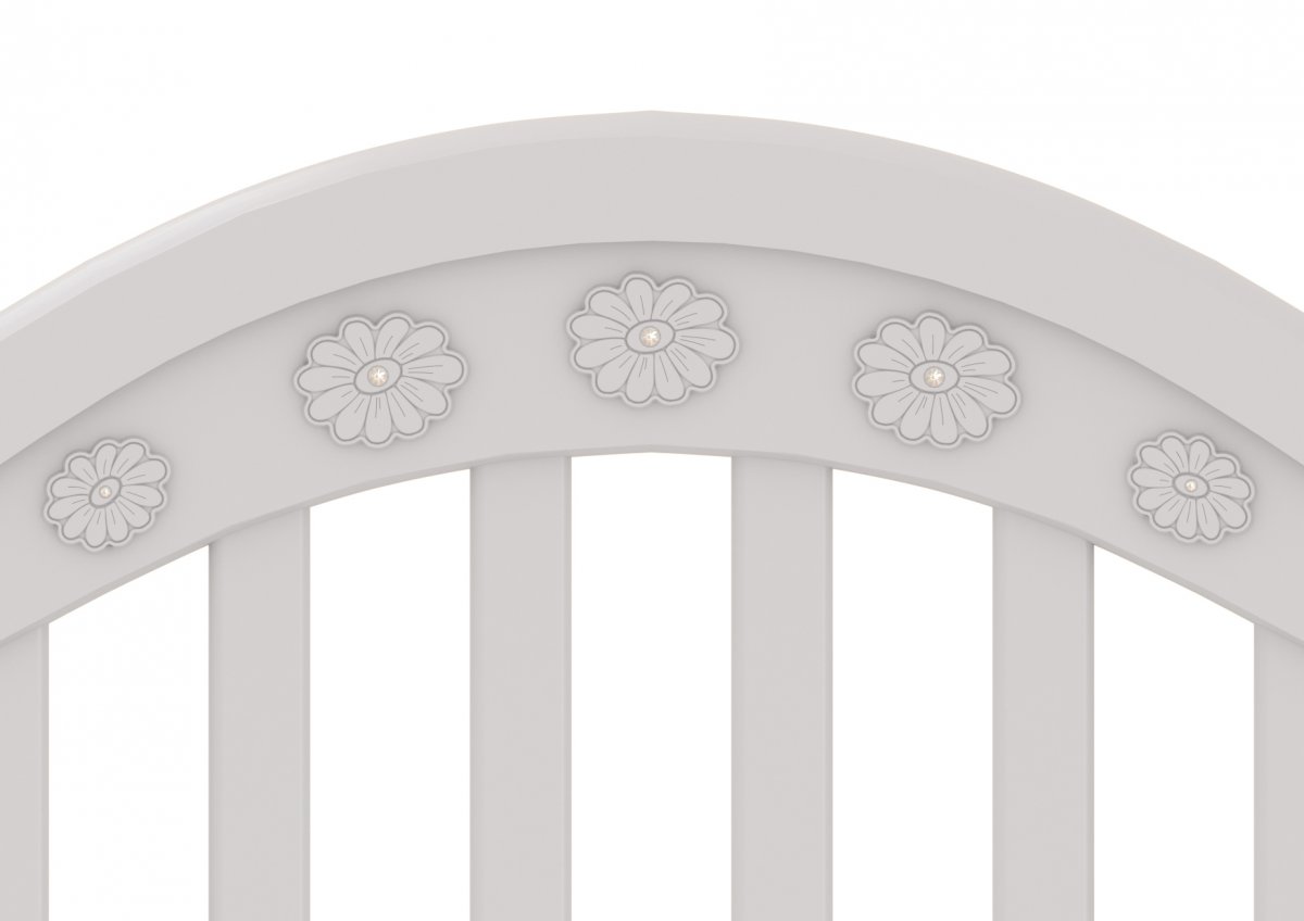 Декоративные аппликации в виде цветов с искрящимися росинками, выполненными из страз Swarovski, придают мягким линиям этой кроватки особого шика и привлекательности.