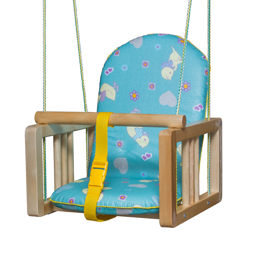 Обивка сидения выполнена из приятной на ощупь влагоотталкивающей ткани, которая очень проста в уходе. Высота качелей от пола легко регулируется родителями, а ограничитель между ножек надежен и убережёт ребенка от случайного соскальзывания с сидения. Кроме того, он фиксирует передний бампер от случайного поднятия ребёнком и защемления пальцев. Каркас качелей выполнен из массива березы – он экологичен, приятен в использовании и прослужит долгое время. В мягких качелях ребенку будет намного комфортнее и приятнее кататься, чем в качелях без обивки, а родители могут быть уверены в том, что ребенок случайным образом не будет травмирован.