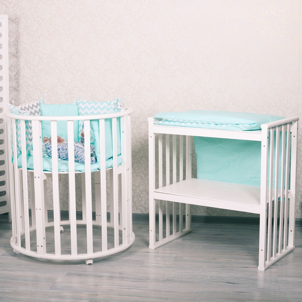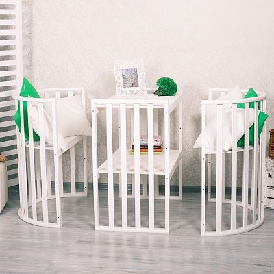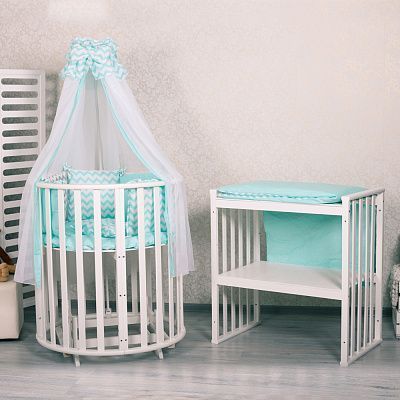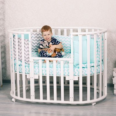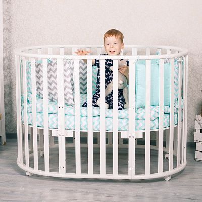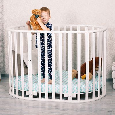 Благодаря круглой форме и колёсикам мама может делать перестановки мебели хоть каждый день. Такая модель считается наиболее безопасной - у неё отсутствуют острые углы, что сводит к минимуму риск травм.