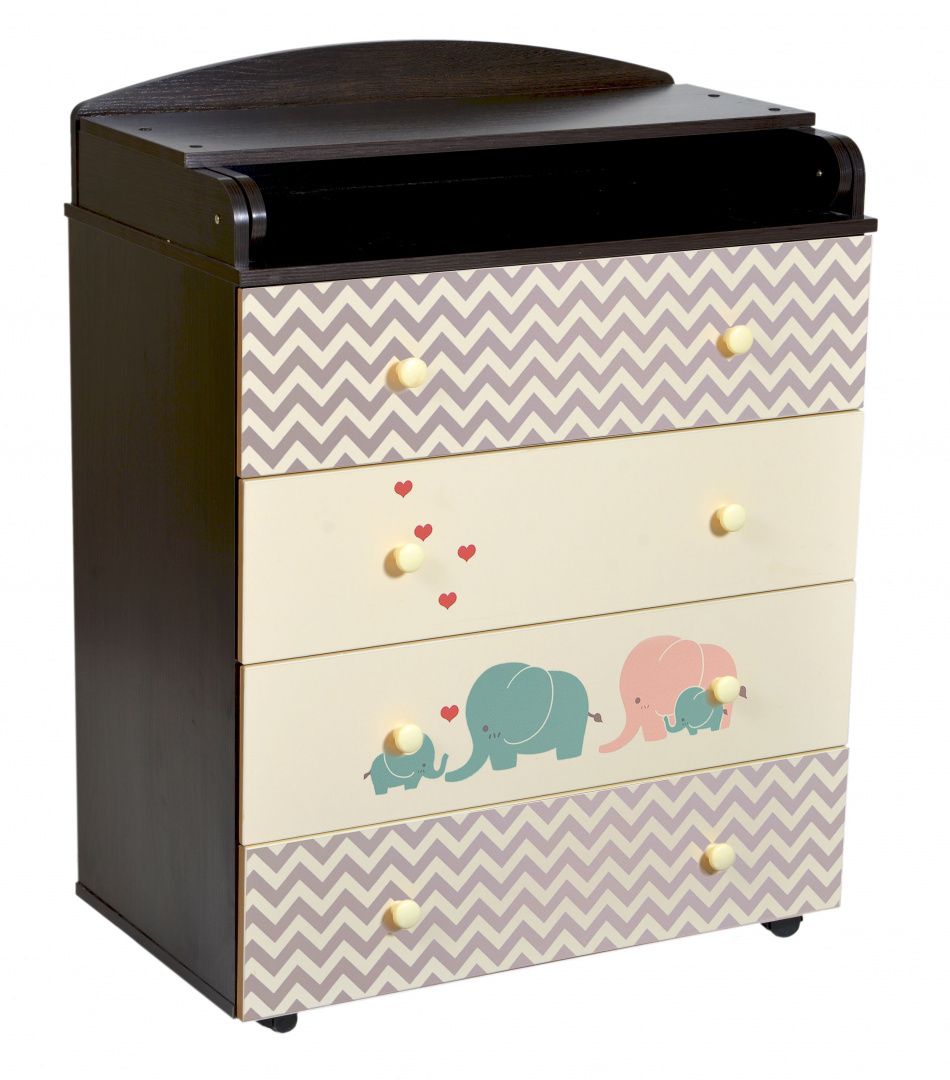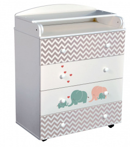 Верхняя крышка комода раскладывается книжкой и образует удобный пеленальный столик. Все торцы комода отделаны скругленными кромками из ПВХ.