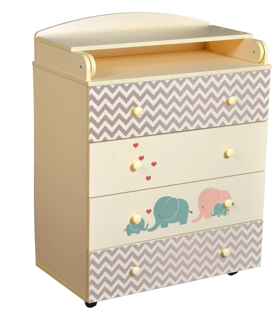 Верхняя крышка комода раскладывается книжкой и образует удобный пеленальный столик. Все торцы комода отделаны скругленными кромками из ПВХ.