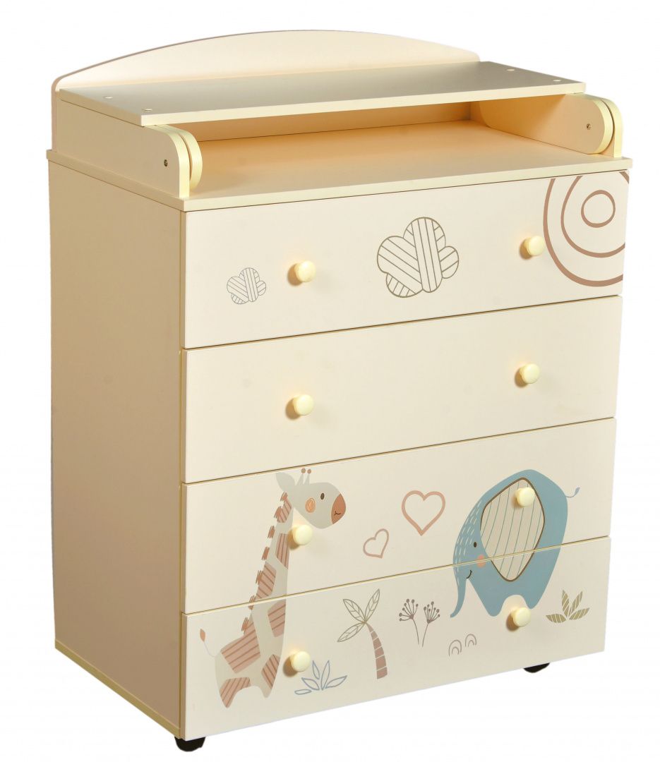 Верхняя крышка комода раскладывается книжкой и образует удобный пеленальный столик. Все торцы комода отделаны скругленными кромками из ПВХ.