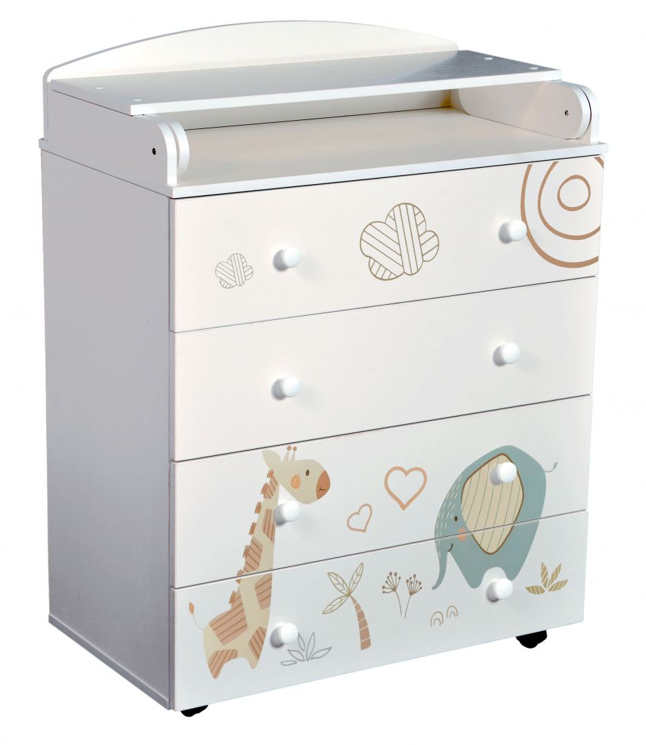 Верхняя крышка комода раскладывается книжкой и образует удобный пеленальный столик. Все торцы комода отделаны скругленными кромками из ПВХ.