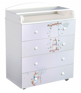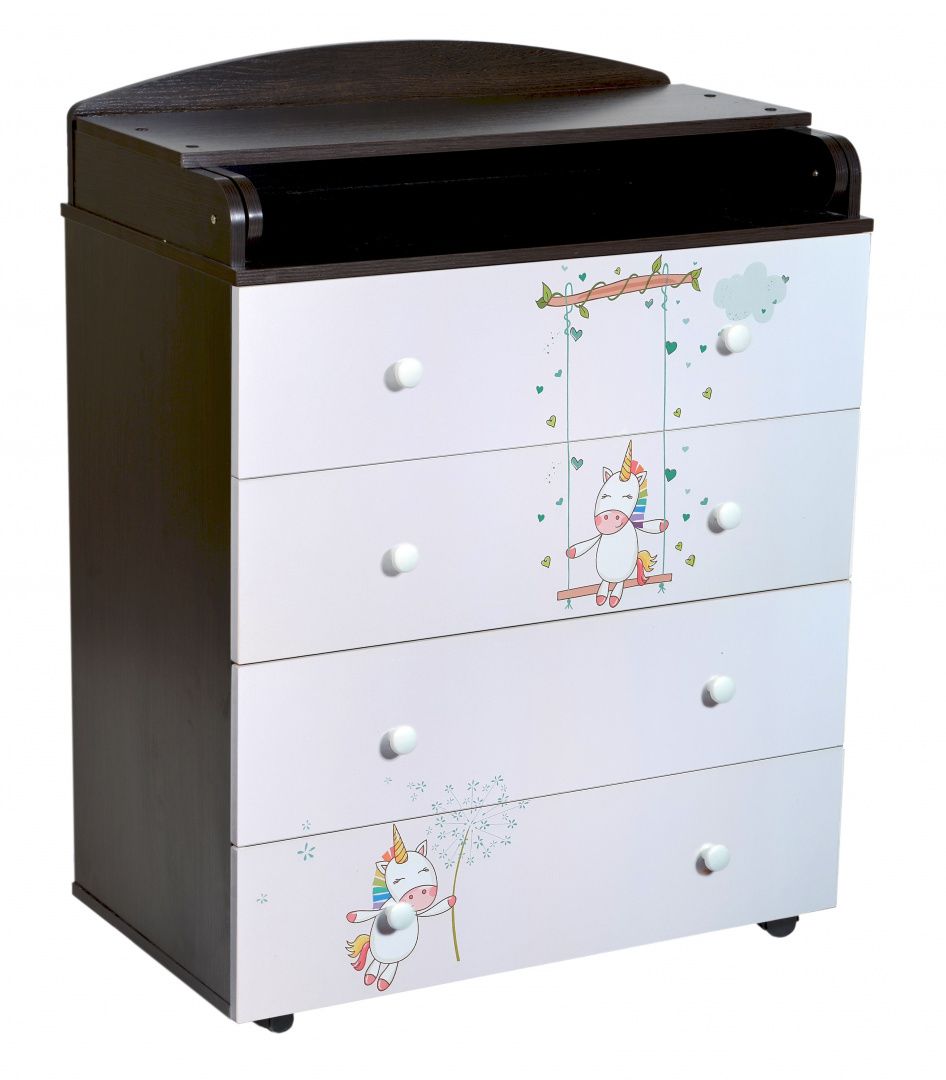 Верхняя крышка комода раскладывается книжкой и образует удобный пеленальный столик. Все торцы комода отделаны скругленными кромками из ПВХ.