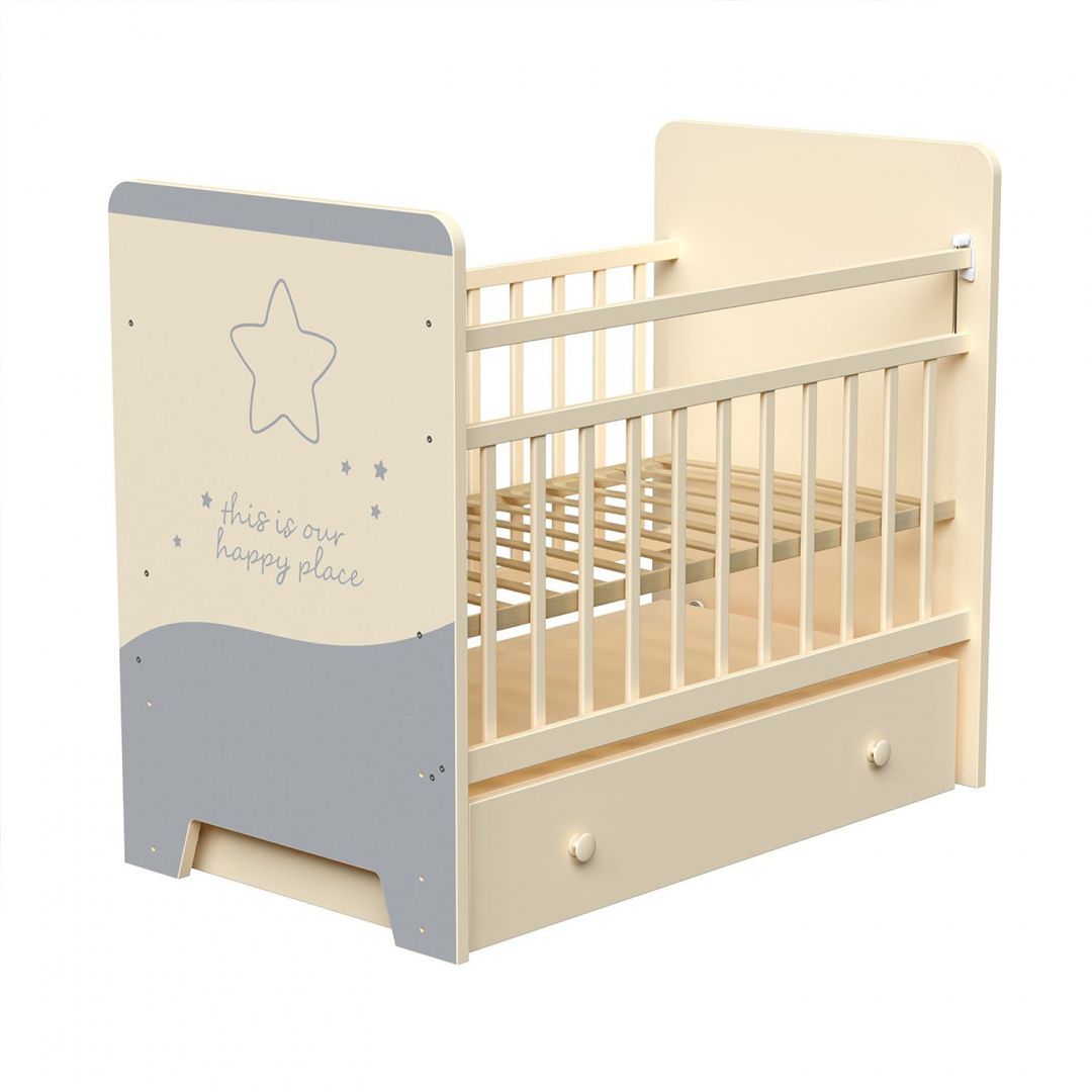 Изящная кроватка в минималистичном оформлении прекрасно подойдет для популярных на сегодняшних день интерьеров. При этом понравится любому малышу своим милым принтом! Модель оснащена поперечным маятником и большим выдвижным ящиком, в который поместятся все аксессуары ребенка. Выполнена из экологически чистых безопасных для малышей материалов - массива березы и ЛДСП. Также, на кроватке откидывается планка, которая позволяет с комфортом помещать в нее даже спящего малыша.