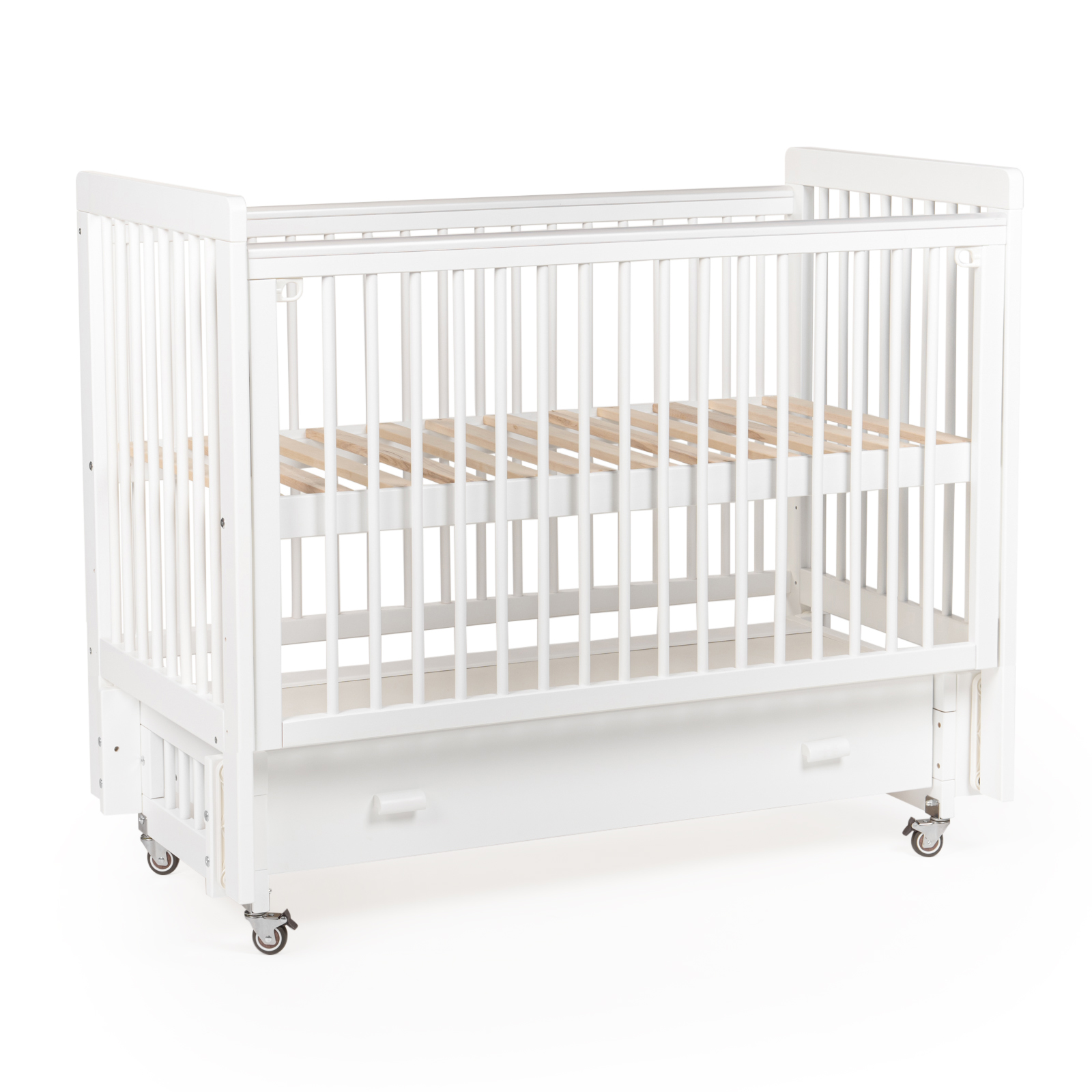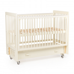 Ложе кроватки имеет три положения по высоте. Регулируемую переднюю стенку (три положения) с возможностью полного снятия за считаные секунды, для удобного доступа к младенцу.