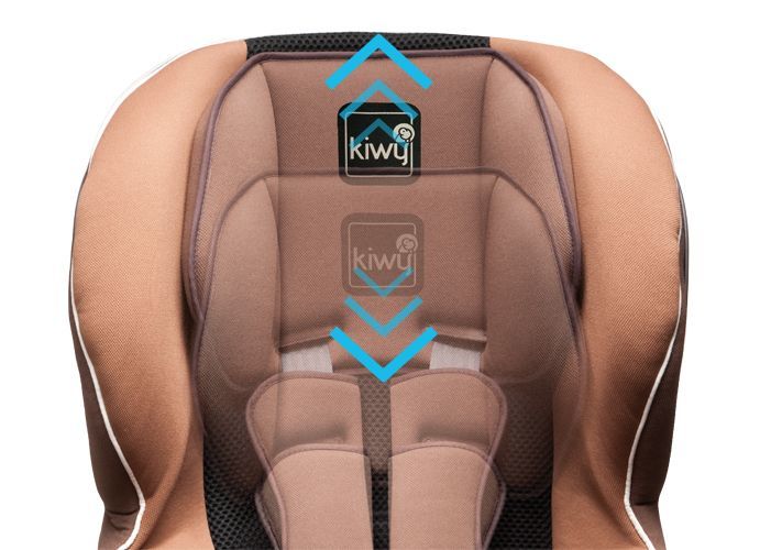 Вместе со встроенными ремнями подголовник Kiwy SP1 имеет регулировки по высоте и устанавливается в 7-ми положениях. Процесс по изменению положения очень прост, поэтому выполняется одной рукой. Это относится и к спинке, настраиваемой в 4-х положениях, которая легко опускается даже с малышом внутри, в том числе спящим.