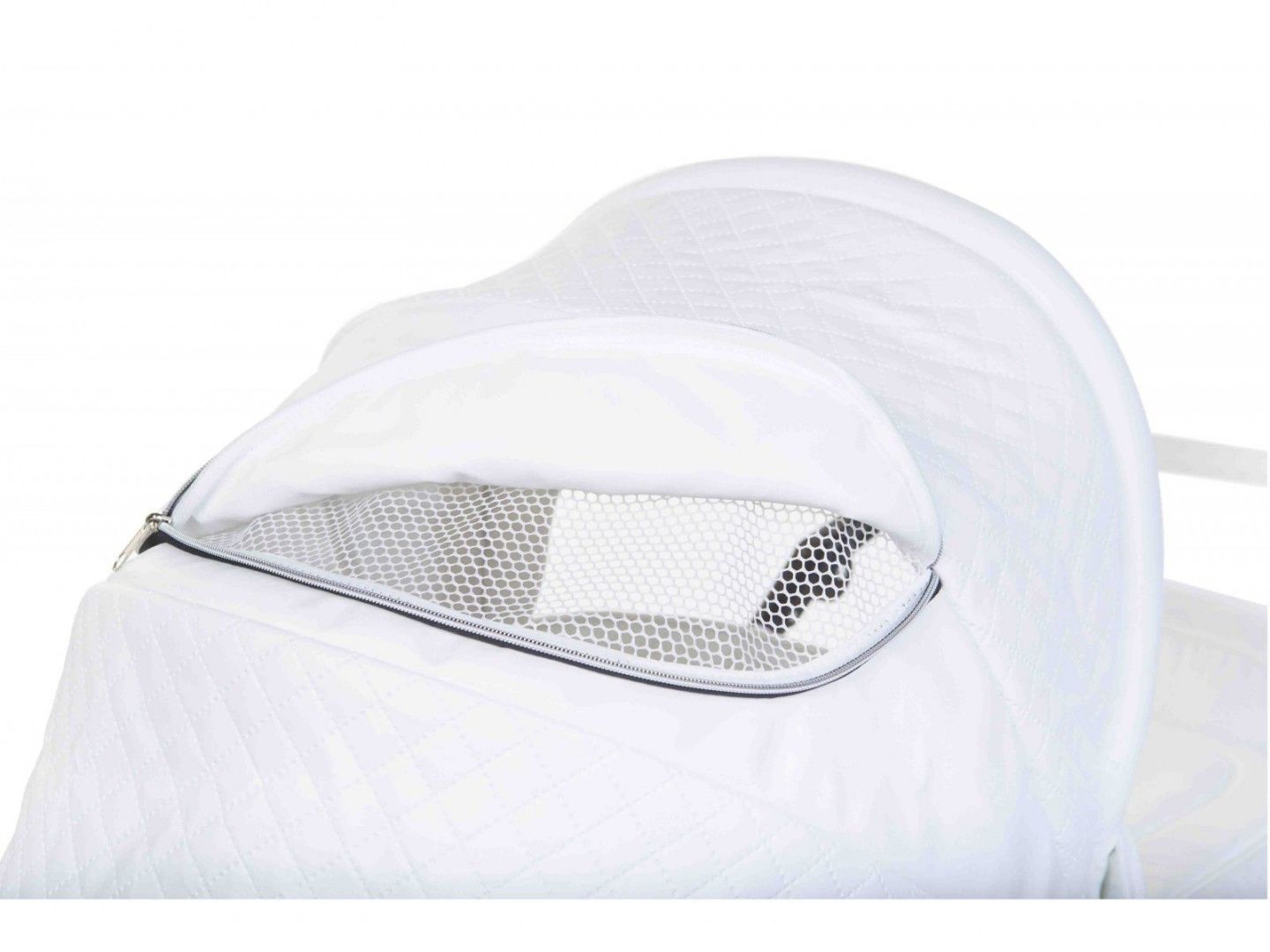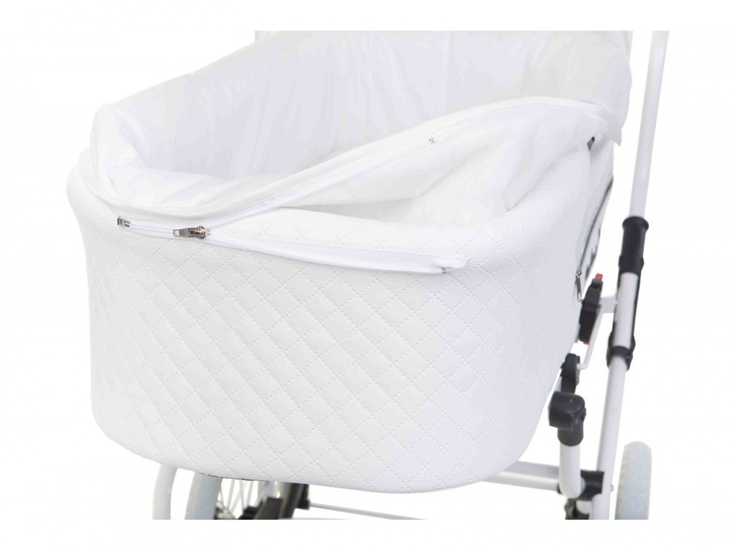 - Сшита из белой эко-кожи со вставками из буклированной кожи со "стеганым" рисунком.