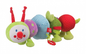 К голове весёлой гусеницы с помощью липучек крепятся четыре мягких сегмента. Благодаря своим креплениям-липучкам, эти сегменты не разъезжаются и остаются на месте именно в таком порядке, в котором их захотел расположить ребёнок. Яркий внешний вид и весёлая рожица гусеницы настроят малыша на положительные эмоции, а сборно-разборное брюшко поможет ему научиться разбирать целое на отдельные части, и наоборот – собирать части в единое целое. Два сегмента выступают в качестве игрушек-погремушек, создавая шумовой эффект при потряхивании.