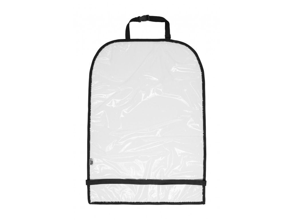 Накидка является универсальным аксессуаром и прекрасно вписывается в любой салон, поскольку выполнена из прозрачной пленки ПВХ, декорированного черной окантовкой. Чтобы зафиксировать накидку, достаточно накинуть ремешок на подголовник, а внизу затянуть специальной резинкой. Накидка держится прочно и не сдвигается, как бы активно малыш не задевал ее ножками.