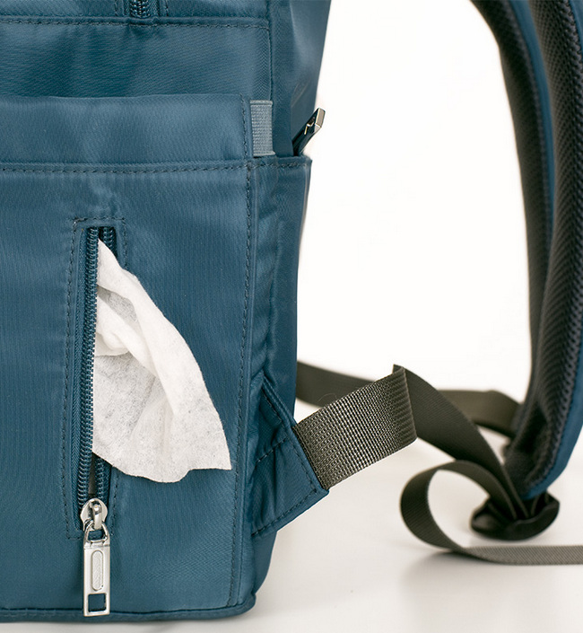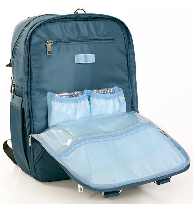Рюкзак включает в себя пеленальный матрасик, косметичку, крепежные элементы на коляску.