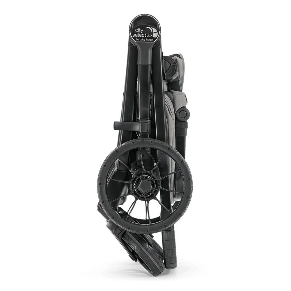 Рама выполнена из алюминиевого сплава, не боящегося ударов и морозов. Коляска складывается простым движением по типу «книжка» вместе с прогулочным блоком, сиденьем внутрь. Baby Jogger City Select Lux одна из немногих моделей, которые можно сложить сразу с двумя установленными сиденьями. В сложенном виде она компактна для своего класса, её удобно переносить. Специальный замок предотвратит случайное самопроизвольное раскладывание. Докупив подножку для старшего ребёнка, мы сможете перевозить сразу троих детишек одновременно!