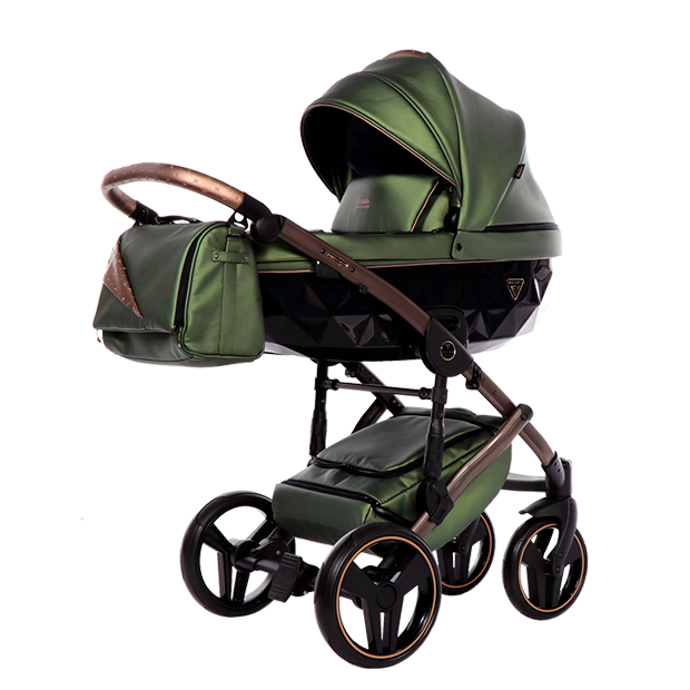 Современные технологии в коляске FLUO LINE II удивительным образом сочетаются с элегантностью оформления. Люлька выполнена из полированного пластика в форме бриллианта, который не только прекрасно смотрится, но и защищает малыша от любого ветра, а капюшон и накидка из эко-кожи отделаны золотом или серебром в цвет рамы коляски.