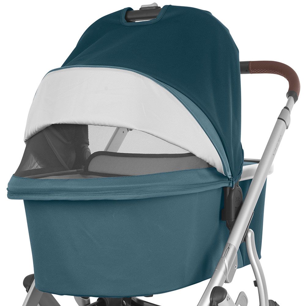 - Капюшон люльки: из плотной ткани с доп. козырьком, на задней части есть вентиляционная секция