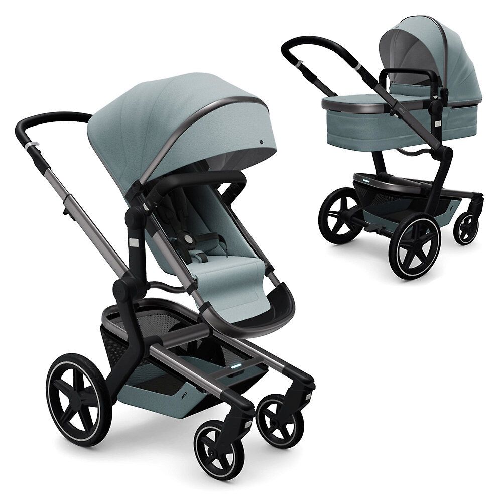 Алюминиевое шасси Joolz Day+ усилено стальными элементами в тех местах, которые чаще всего подвергаются нагрузке. Рама коляски легко складывается как с прогулочным блоком, так и без него. Квартет передних и задних колес с амортизацией, выполненных из вспененной резины, дарит коляске превосходные ходовые качества. Передние колеса – поворотные, они обеспечивают улучшенную маневренность. Блокировка колес в прямом положении потребуется, чтобы проехать по сложным участкам дорог, например, по снежной каше или песку. Фиксация осуществляется простым нажатием носком на соответствующие кнопки. Тормоз привычно расположен между задних колес, не испортит дорогие туфли мамы.
