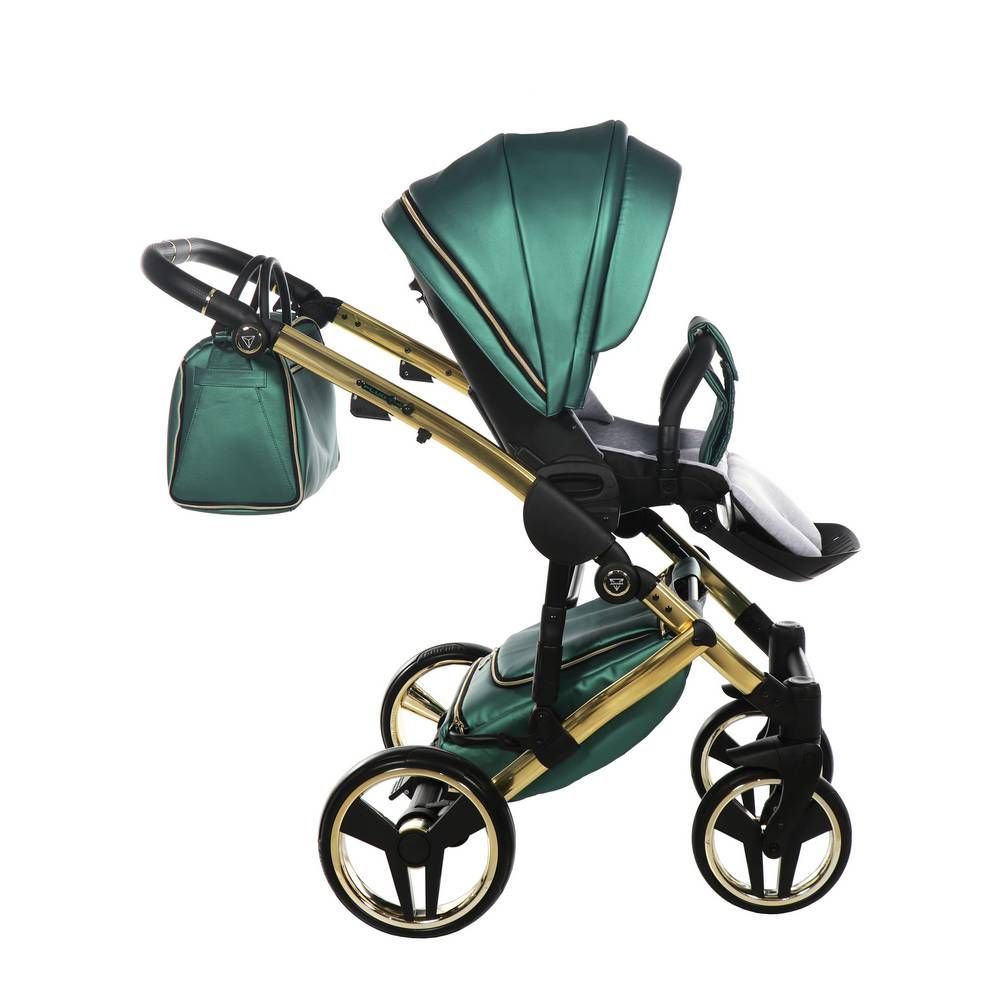 Современные технологии в коляске FLUO LINE II удивительным образом сочетаются с элегантностью оформления. Люлька выполнена из полированного пластика в форме бриллианта, который не только прекрасно смотрится, но и защищает малыша от любого ветра, а капюшон и накидка из экокожи отделаны золотом или серебром в цвет рамы коляски.