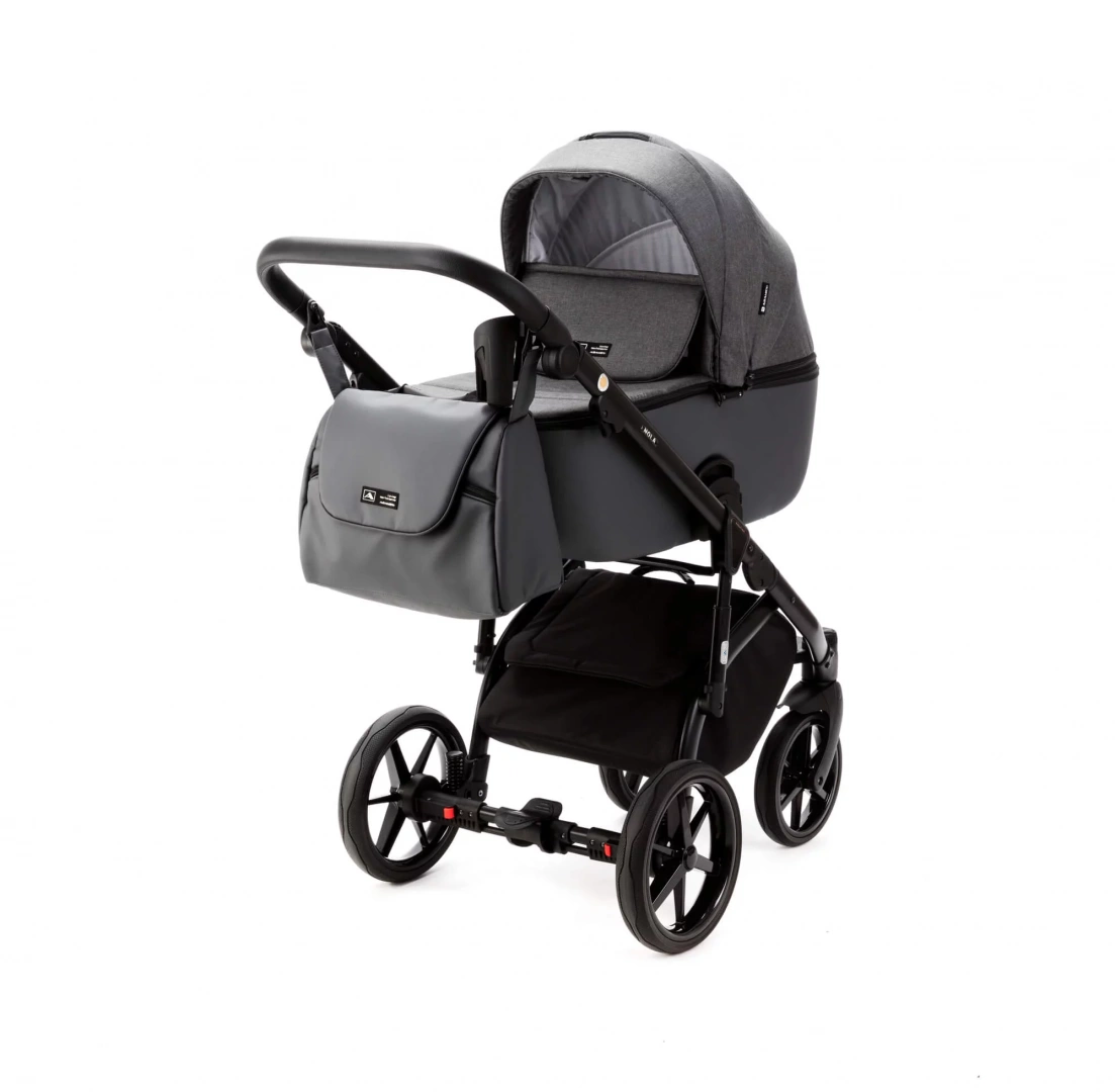 Амортизация и Тормоза: модульная детская коляска Adamex Nola Tip 2 в 1 оснащена 4-мя амортизаторами для гладких поездок и тормозом для вашего спокойствия. Рама, с регулируемой в девяти положениях ручкой, и весом всего 6.2 кг делает управление коляской легким и удобным.