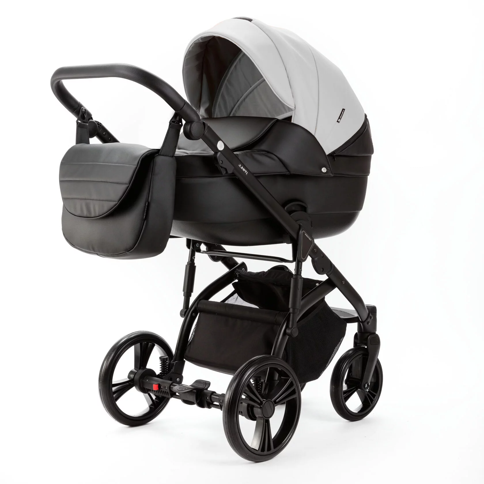 Ручка регулируется под рост родителей в 8 положениях. Сумка для детских вещей открытого типа, крепится на молниях к раме. На раме расположены амортизаторы, для плавного хода коляски, регулируются в 2 положениях - мягко и жестко.