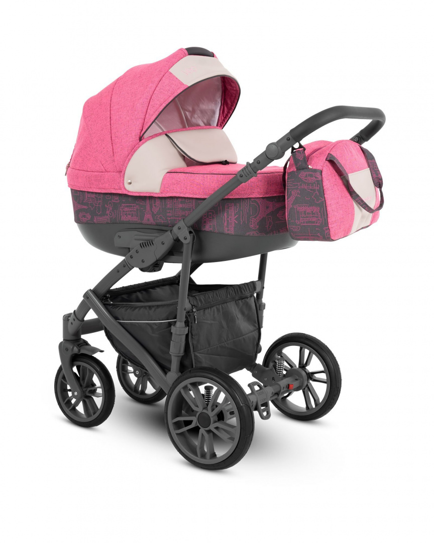 Коляска укомплектована стильной вместительной сумкой для мамы и объёмной закрытой корзиной (до 5 кг) для покупок из износостойкой ткани с удобным доступом, съёмным держателем для бутылочек, москитной сеткой и плотным дождевиком.