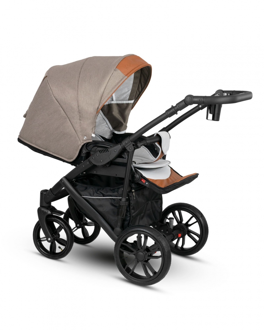 Конструкция рамы изготовлена из облегчённого алюминиевого профиля с дополнительной амортизацией. Коляска укомплектована надувными колёсами на подшипниках. Надёжная тормозная система EASY STOP приводится в действие одним лёгким нажатием педали. Благодаря поворотным передним колёсам обеспечивается идеальная маневренность. Для движения по прямой предусмотрена фиксация передних колес.