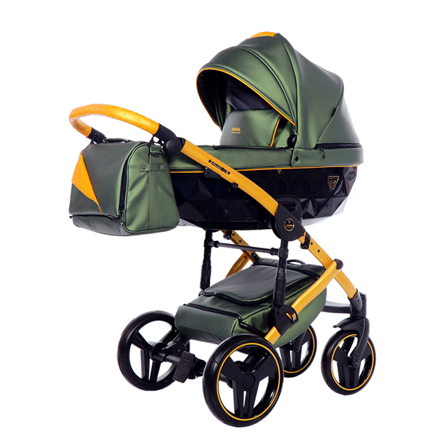 Современные технологии в коляске FLUO LINE II удивительным образом сочетаются с элегантностью оформления. Люлька выполнена из полированного пластика в форме бриллианта, который не только прекрасно смотрится, но и защищает малыша от любого ветра, а капюшон и накидка из экокожи отделаны золотом или серебром в цвет рамы коляски.