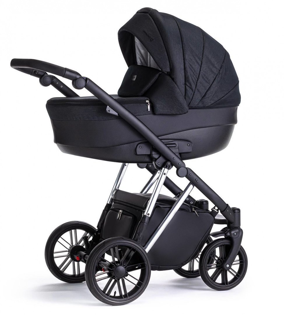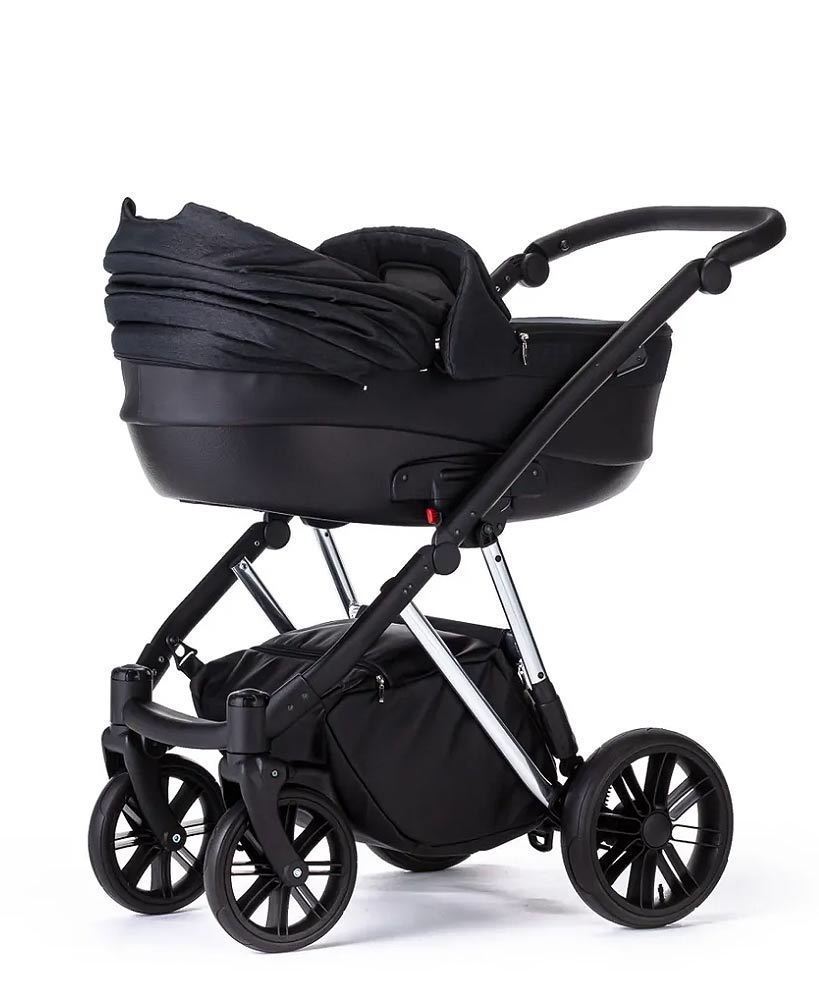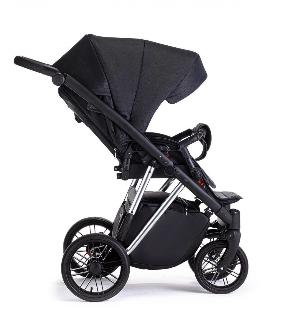 - Большая пластиковая люлька обтянутая перфорированной эко кожей (низ люльки) и высококачественной тканью на капюшоне с декоративными элементами из эко кожи.