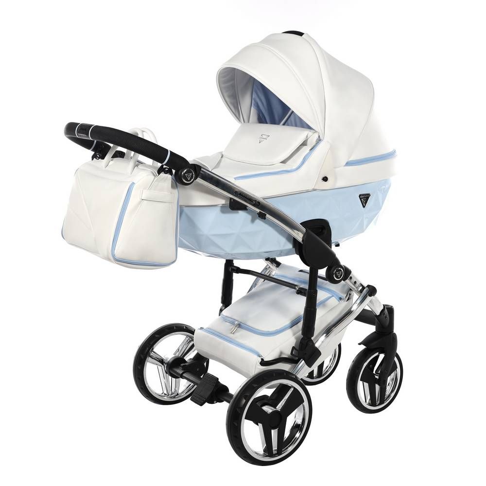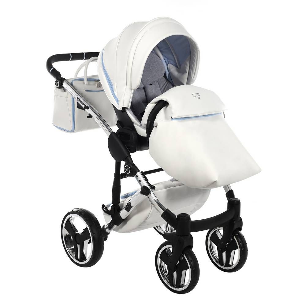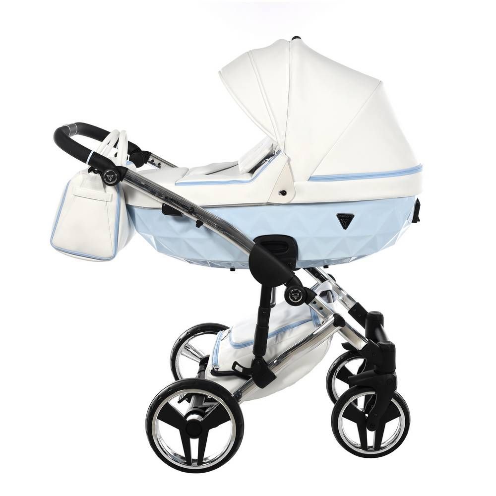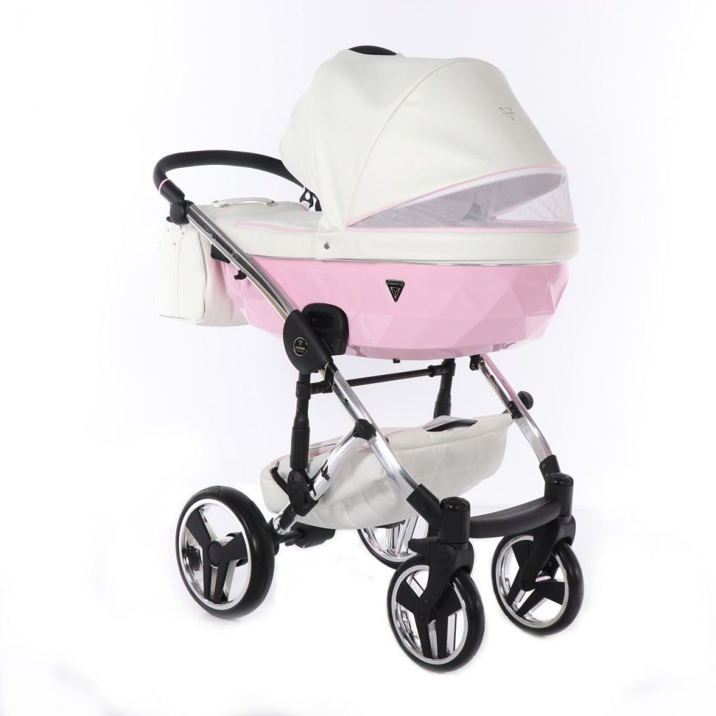 Бриллиантовый короб коляски Junama Candy напоминает вкусный, сладкий, сливочный леденец. А блестящая и придающая элегантный стиль хромированная рама создает нежный образ коляски.