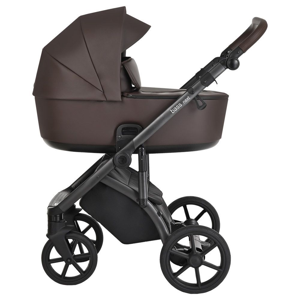 Ручка коляски Bass Next Eco регулируется по высоте, обеспечивая комфортное управление для родителей любого роста. Она имеет удобный хват и покрыта приятной на ощупь экокожей с прострочкой. Вместительная корзина для покупок защищает вещи от выпадения или попадания грязи. Удобная педаль тормоза не пачкает обувь. Коляска складывается двумя руками, становясь компактной и удобной для хранения.