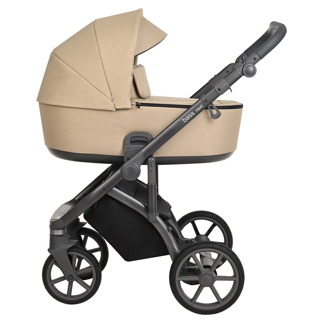 Cистема SAS-4 амортизаторов, расположенных на задних колёсах и на стойках шасси, позволяет настраивать плавность хода, а благодаря возможности отключения амортизации на стойках, вы можете легко приспособить коляску к любым дорожным условиям. Bass Next мягко и плавно едет даже по бездорожью, бережно охраняя сон новорожденного. Большие колеса с непрокалываемыми покрышками долговечны и надежны. Передние колёса с системой «анти-шок» вращаются на 360 градусов, с возможностью фиксации в прямом положении.