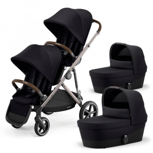 Cybex Gazelle S – это элегантная многофункциональная коляска для новорожденных двойняшек. Комплектация с двумя люльками и двумя сиденьями предназначена для использования с рождения малышей до 3-4 лет. Младенцы лежат в удобных спальных блоках, после чего на шасси устанавливаются прогулочные сиденья. Обычно двухместные модели громоздкие и массивные. С Gazelle S таких проблем не будет – ширина колесной базы оптимальна, коляска хорошо рулится и складывается с установленными сиденьями. Вы легко сможете гулять по парку или супермаркету вместе с детьми.
