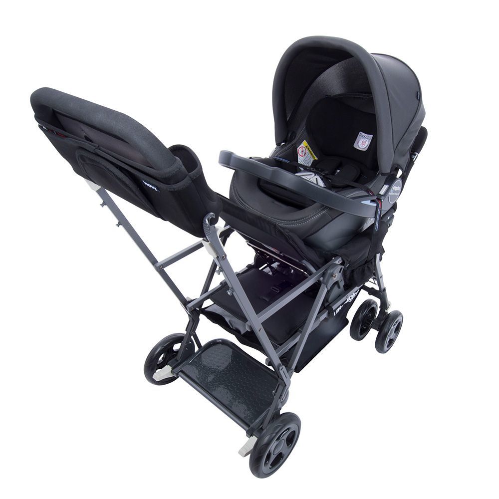 Задняя часть коляски предназначена для ребенка от 2,5 лет. Там он может стоять лицом к маме или по ходу движения, чтобы общаться с младшим братишкой или сестренкой. Когда малыш устал стоять, он отдохнет на удобном сиденье, оборудованном трехточечными ремнями безопасности. Если ваши дети одинакового возраста, вы можете приобрести полноценное заднее сиденье Joovy Rear Seat. На переднюю половину предусмотрена установка автокресла 0+ при помощи специальных креплений и ремней, входящих в комплект коляски. Теперь не нужно брать на прогулку сумочку для ключей и телефона, ведь на родительской ручке есть органайзер для мелочей с подстаканниками и встроенной шторкой от солнца на заднее сиденье.