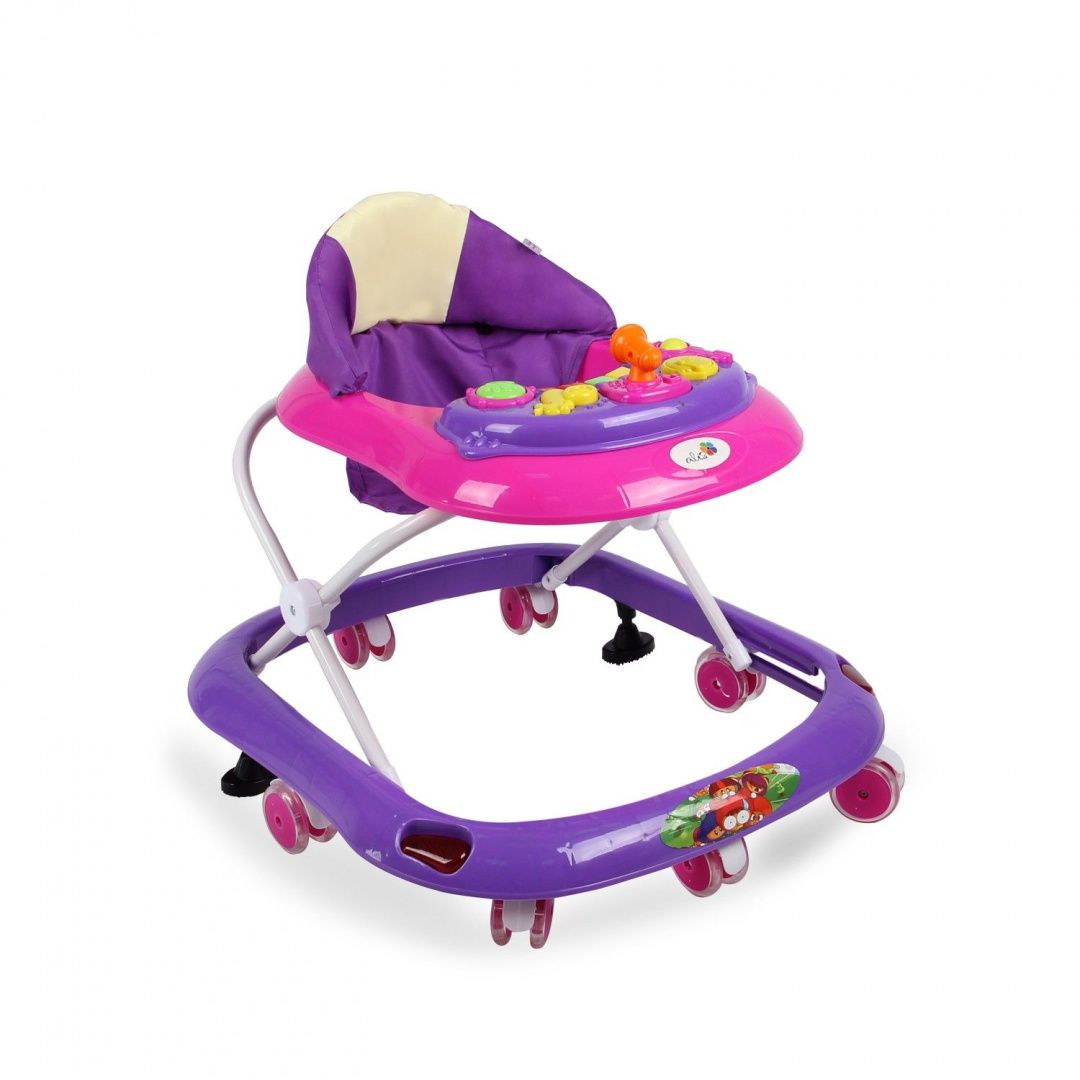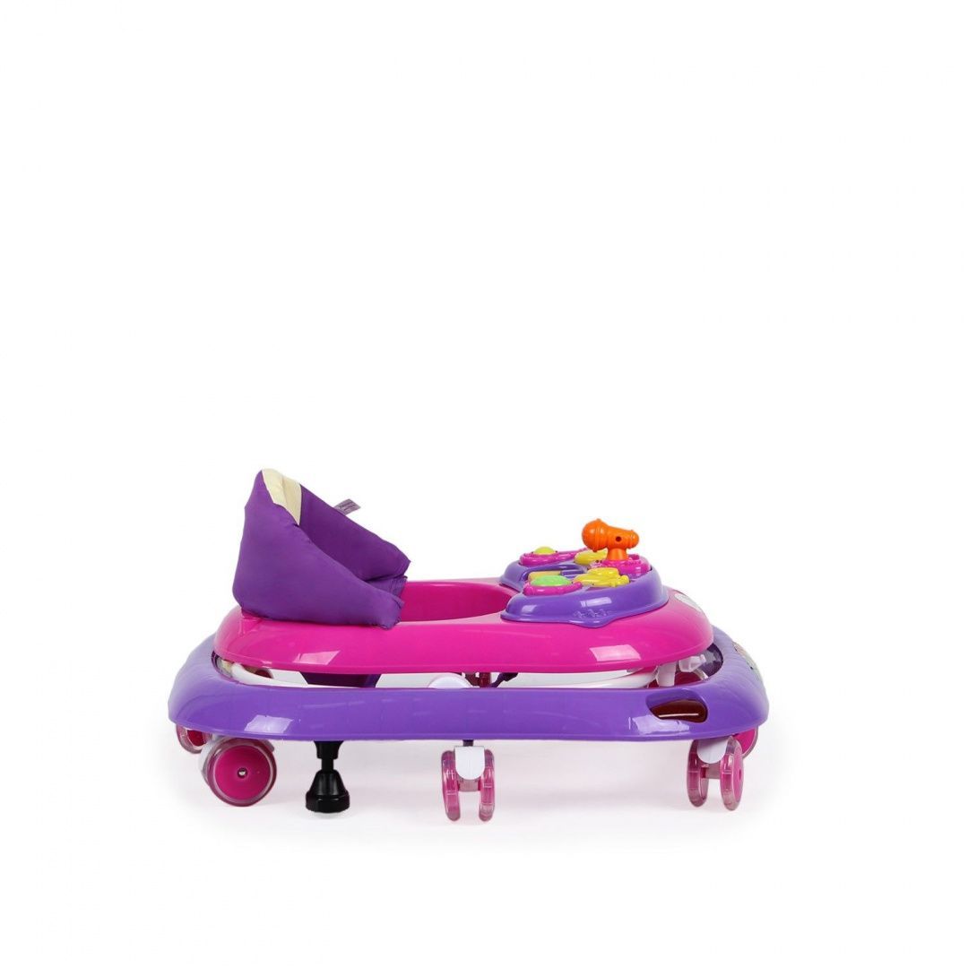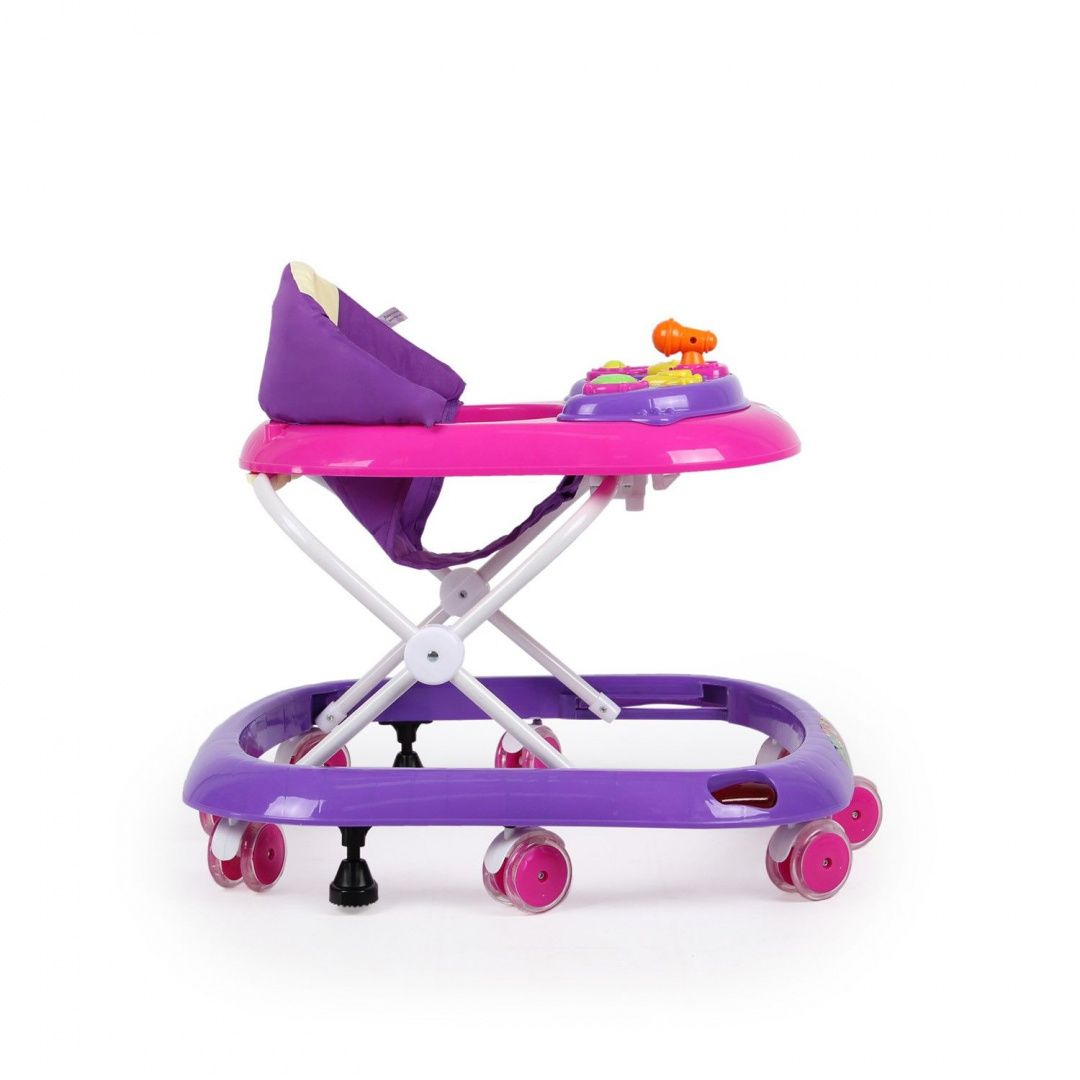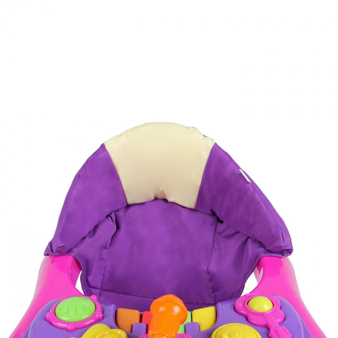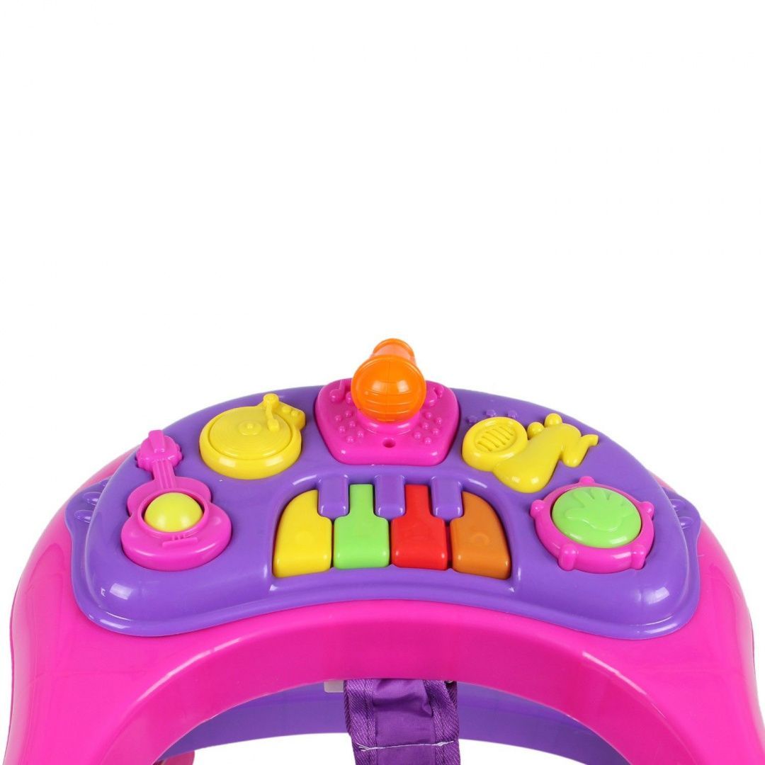Колеса, размещенные по периметру базы, обеспечат плавный ход. Возможность поставить колеса на тормоз поможет маме приглядеть за малышом и не переживать, что он «укатится» без ее ведома. На ходунках имеются световые и музыкальные элементы, которые развлекут кроху. Несколько уровней по высоте позволят подобрать соответствующий комплекции ребенка.