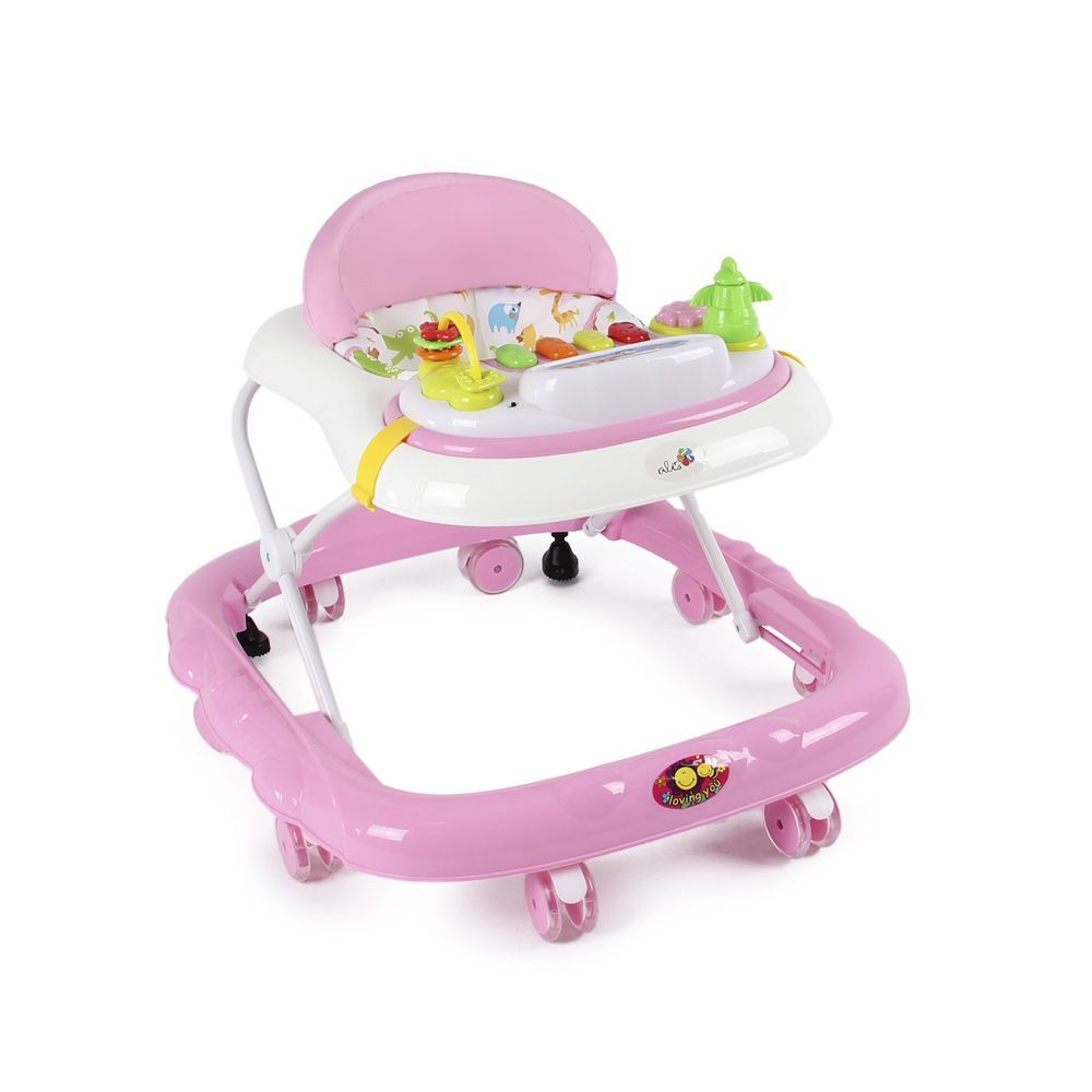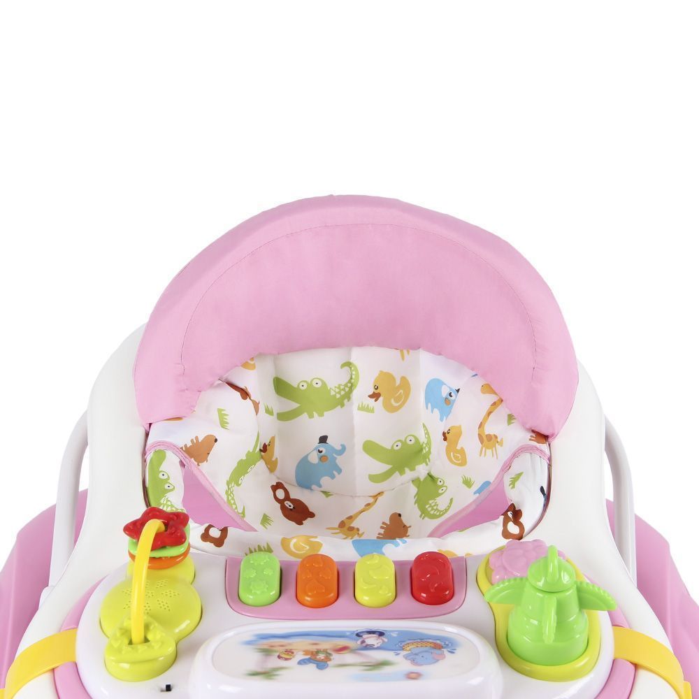 Колеса, размещенные по периметру базы, обеспечат плавный ход. Возможность поставить колеса на тормоз поможет маме приглядеть за малышом и не переживать, что он «укатится» без ее ведома. На ходунках имеются световые и музыкальные элементы, которые развлекут кроху. Несколько уровней по высоте позволят подобрать соответствующий комплекции ребенка.