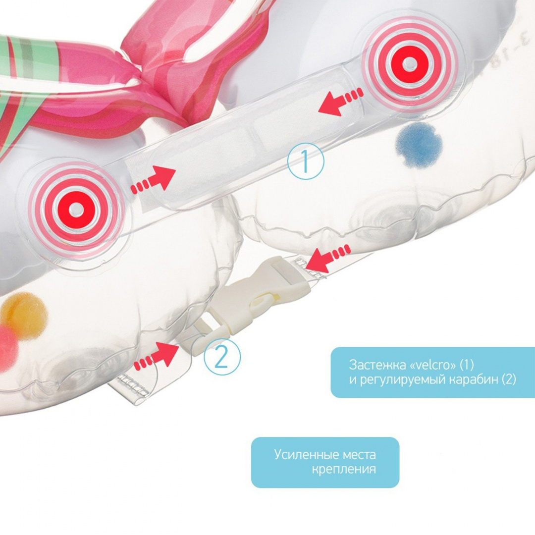 - две надежные застежки для быстрой и простой фиксации круга на шее малыша. Места крепления застежек усилены