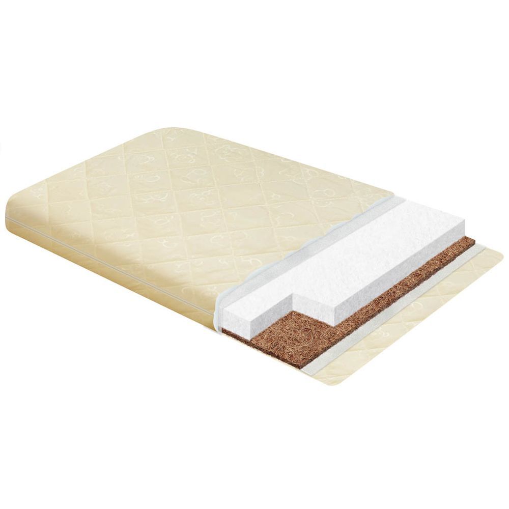 Вторая сторона представлена плитой из кокосового латексированного полотна – это материал полностью растительного происхождения. Латексная пропитка делает плотное кокосовое волокно эластичным и устойчивым к деформации. Материал не накапливает влагу, не крошится и не образует пыли, обеспечивая отличную вентиляцию, гигиеничность и высокие ортопедические свойства, важные для малышей.