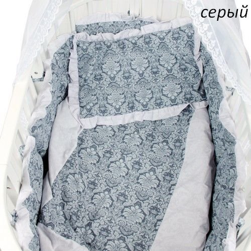 Бортики дополнительно украшены шикарными двойными оборками по всему периметру. Их особенностью является сочетание двух материалов с рельефным рисунком, благодаря чему комплект может быть как в более светлой, так и в более темной гамме. Бортики снабжены длинными удобными завязками с трех сторон. Мягкий, гладкий, полупрозрачный, струящийся балдахин из нежной микросетки - имеет тончайшую, еле заметную ячеистую основу и создает пластичные складки. По передним планкам балдахин украшен широким кружевом, с вышитым растительным орнаментом. Сверху балдахина тканевая вставка в тон комплекту, которая выгодно скрывает основу держателя.