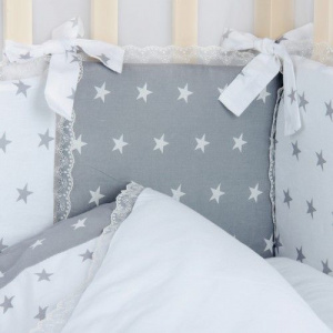 - Бортики умеренной высоты, необходимой, чтобы поддерживать необходимый воздухообмен и защитить ребенка от сквозняков. Чередование светлых и темных, больших и маленьких деталей позволит родителям обустроить ложе кроватки наилучшим образом. Каждый бортик окружен кружевом с трех сторон, благодаря чему создается красивый эффект невесомости и легкости;