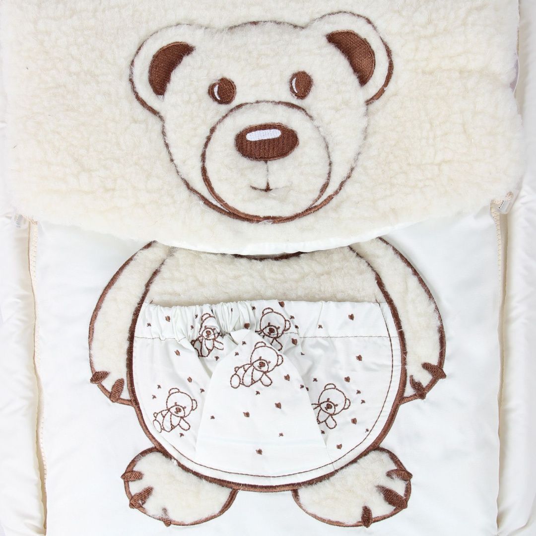 Очень удобный зимний конверт на боковых молниях с капюшоном, подушечкой на меху. Украшен дублирующей вышивкой.