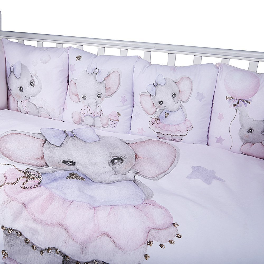 - Комплектация: бортик-подушечки 30х30 см-12шт, пододеяльник 100х118 см, простыня на резинке 90х150 см для матраса 60х120 см, наволочка 40х60 см; одеяло 100х118 см, подушка 40х60 см (бязь - хлопок 100%, наполнитель ПЭ 100%)