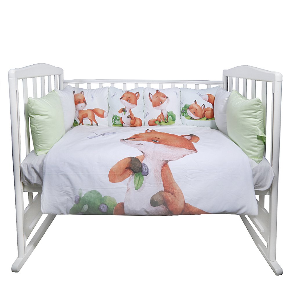 - Комплектация: бортик-подушечки 30х30 см-12шт, пододеяльник 100х118 см, простыня на резинке 90х150 см для матраса 60х120 см, наволочка 40х60 см; одеяло 100х118 см, подушка 40х60 см (бязь - хлопок 100%, наполнитель ПЭ 100%)