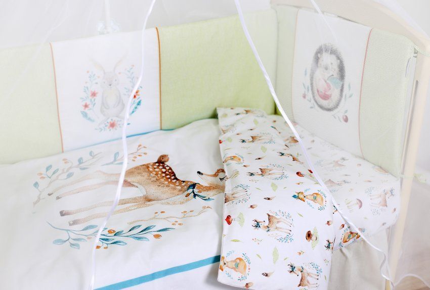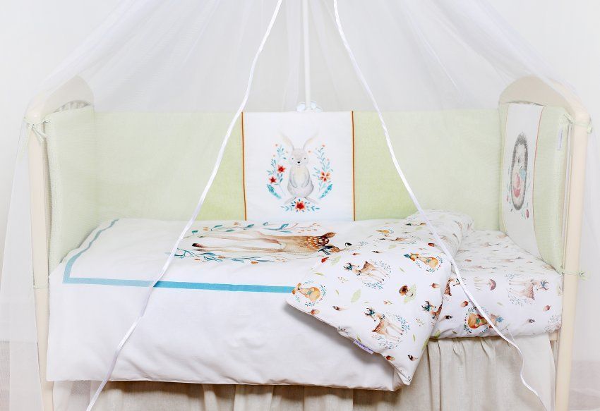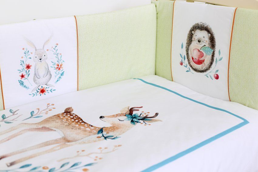 Милый и комфортный комплект постельных принадлежностей для детской кроватки, из коллекции «Волшебный лес» , выполнен из высококачественного поплина европейского качества (международный сертификат качества OEKO-TEX Standart 100).