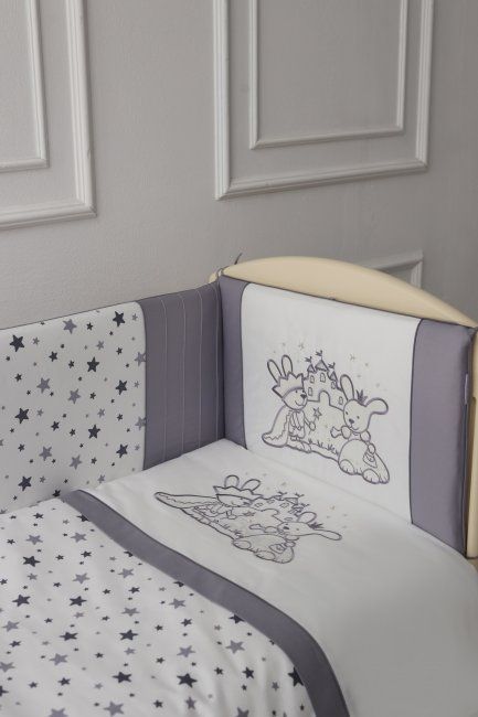 Изделие традиционно украшено тонкими кантами, отделочными строчками и изящной вышивкой. Чехлы бортиков съемные на молниях, что значительно упрощает уход за ними.