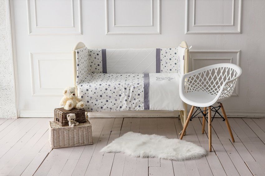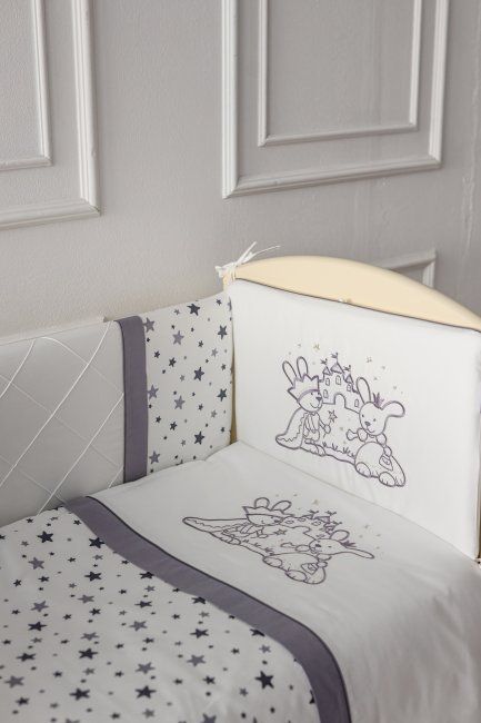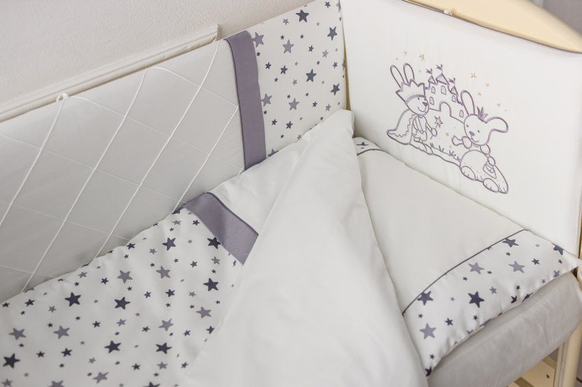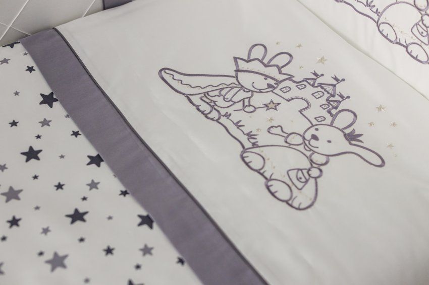 Изделие традиционно украшено тонкими кантами, отделочными строчками и изящной вышивкой. Чехлы бортиков съемные на молниях, что значительно упрощает уход за ними.